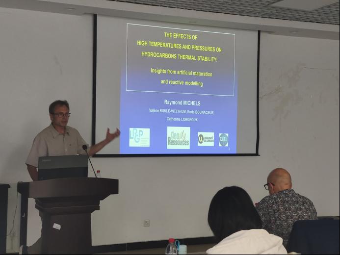 Raymond Michels是CNRS的研究员,通过自然样本和实验室分析研究地质长期碳循环中有机物的性质和反应性。主要研究课题集中在天然气、石油、煤及其在地质过程中的意义,烃类的生成和演化、流体-岩石相互作用、矿床形成。Raymond Michels教授以《The effects of high temperatures and pressures on hydrocarbons generation and thermal stability: insights from artificial maturation and reactive》为题,从在封闭系统和高压含水热解实验中水和压力对原油生成的影响、不同温度下压力对烷烃裂解的影响、H2S对高温高压下烷基苯热裂解的影响三个方面为同学们讲解油气成藏过程中高温高压对烃类生成和热稳定性的作用机理。