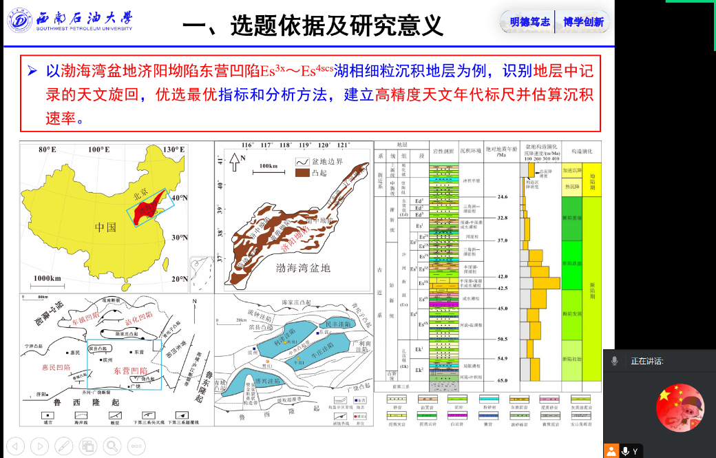 紧接着于乐丹博士为同学们带来第二场讲座。以陆相湖盆中细粒沉积地层广泛发育的东营凹陷Es3x~Es4scs为例,在计算了古近纪时期地球轨道要素偏心率、斜率和岁差周期的基础上,对不同沉积序列替代性指标和时间序列分析方法进行了优选,最终确定出最优的指标为地球物理参数数据,最优的方法为TSAM1,并依据最优的方法和指标建立研究区高精度天文年代标尺估算了沉积速率。