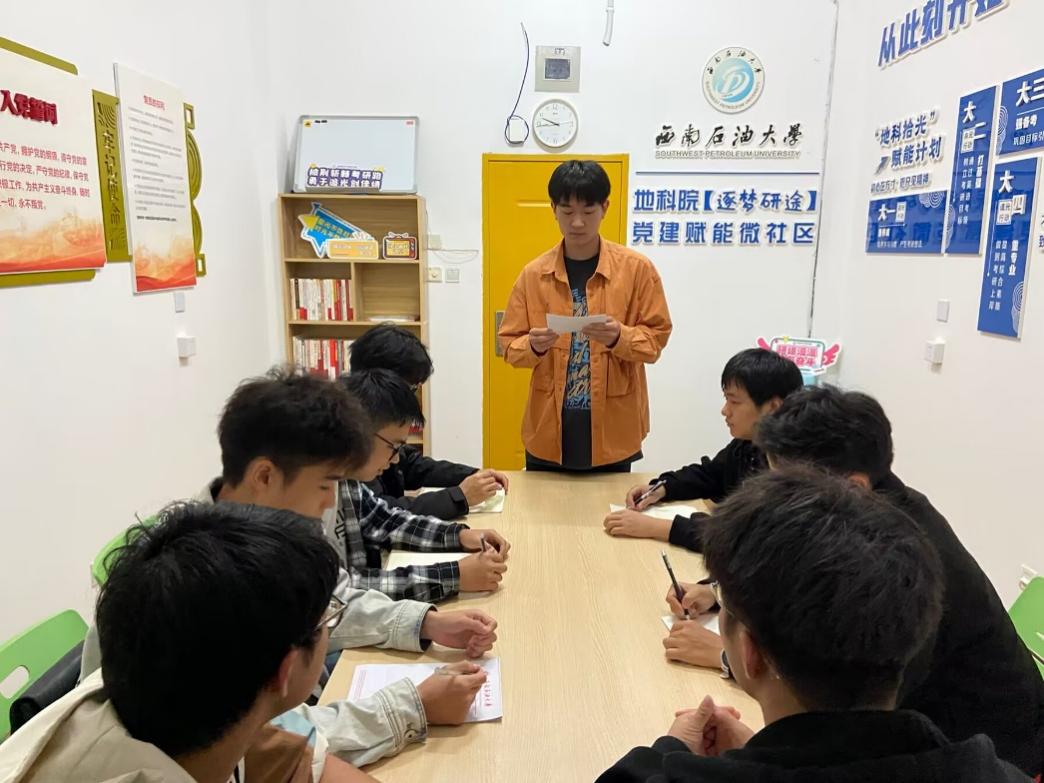 10月地科院党建赋能微社区以宣传写作、青年责任、国学文化为主题,在20栋A区130室开展了宣传思想、青年责任、国学文化为主题的学习思享荟活动,引导青年学生用党的创新理论武装头脑、指导实践。