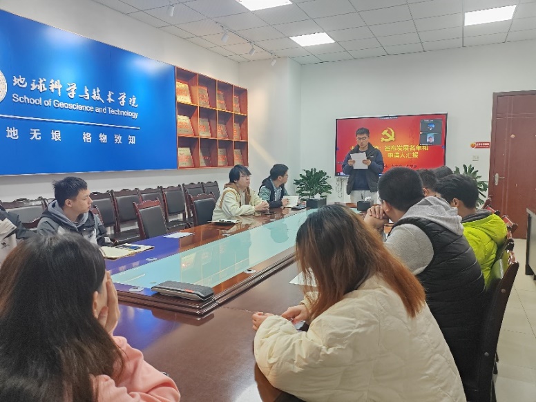 2023年11月15日下午,地科院硕士2022级第二党支部于明辨楼A302召开支部会议,讨论吸收朱采薇等三名同志为中共预备党员的相关事宜。本次会议由支部副书记顾天甫同志主持,本支部全体党员、发展对象参会。本次会议严格按照党组织接收预备党员各项程序进行。