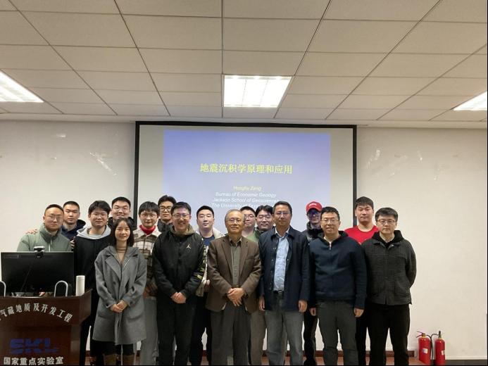 本次讲座以《地震沉积学原理和应用》为题,从地震沉积学的原理和地震沉积学历年实际应用两方面深度阐述了地震沉积学在国际范围内的发展和应用模式。曾教授提出了地震沉积学是以现代沉积学和地球物理学为理论基础,利用三维地震资料,经过层序地层、地震属性分析和地层切片,研究地层岩石宏观特征、沉积结构、沉积体系、沉积相平面展布以及沉积发育史的地质学科这一概念;解释了地震岩石学的相关理论,其是指调整地震资料使地震波同相轴可以像测井资料一样解释地层岩性,地震岩石学研究要求把三维地震数据体转化成测井岩性体,在岩性体里将GR和SP测井曲线反映岩性的测井曲线和临近的地震反射进行结合可以更好地从地震资料上判断圈闭。曾洪流教授将地层切片技术应用于河道(路易斯安那州上新统)、河控三角洲(密西西比三角洲)、海底扇(墨西哥湾)滑塌体和海地峡谷(路易斯安那州陆坡和海地峡谷)的识别和描述,取得良好的应用效果。