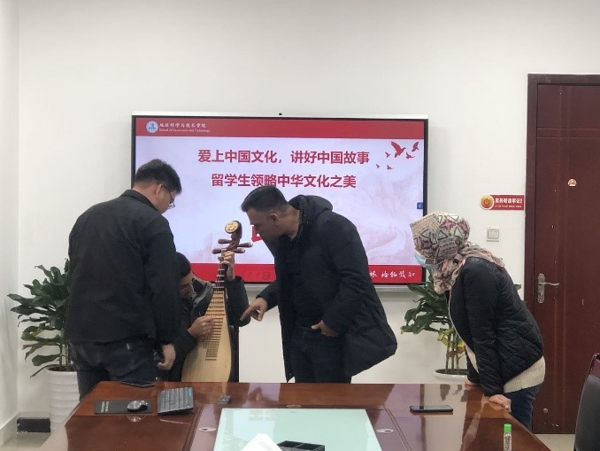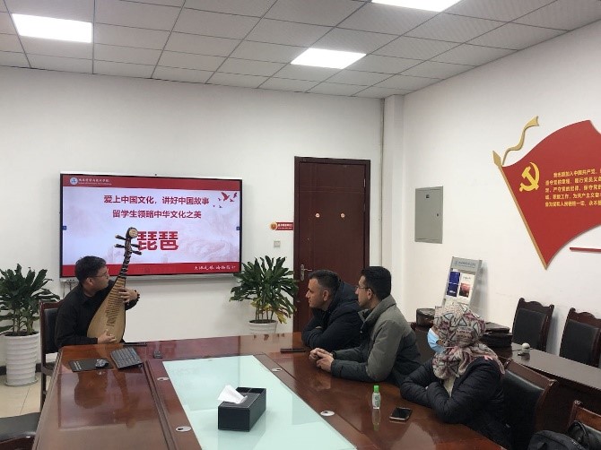 为了讲好中国故事,传播好中国声音,促进中外文化交流,让来华留学生深入了解中国传统文化,地科院举办爱上中国文化·讲好中国故事系列活动,让留学生领略中华文化之美。12月14日,王晨晨老师邀请留学生了解中国传统乐器——琵琶,现场由地质学2021级同学付亦豪演奏,让留学生零距离感受中华传统文化。