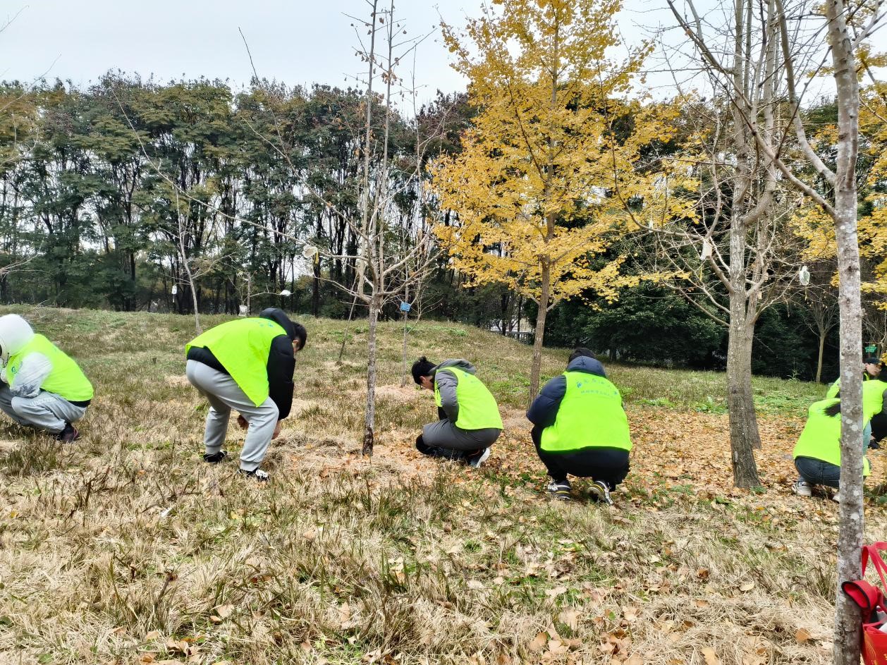 活动开展过程中,志愿者按照分工参与拔草,浇水,松土等工作。虽然寒风凛冽,但是志愿者工作的热火朝天。志愿者们积极主动参与劳动,相互协作,很快就将多余的杂草清理干净。冬日的感恩林盖上了银杏叶织就的大绒毯,而志愿者工作的身影也为寒冬的感恩林带来了一阵暖风。