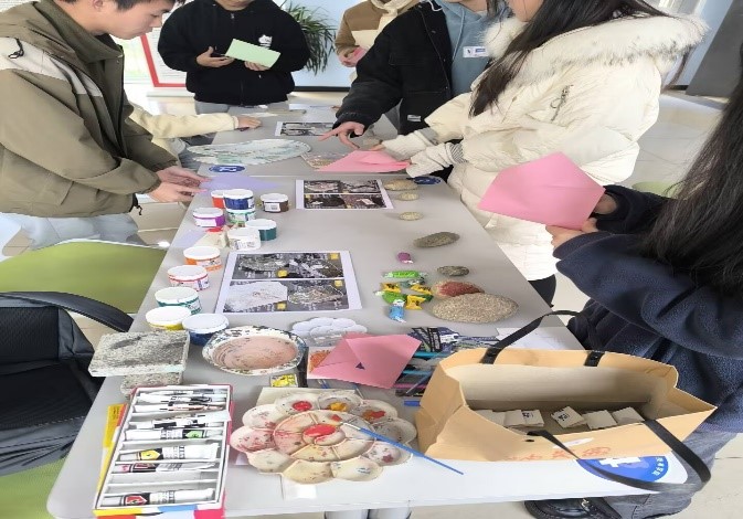 活动第一个环节,同学们从纸袋中抽取出一张写有岩石名的纸条,并写下描述性词语。接着,工作人员将事先准备好的岩石图片分发给同学们,并组织同学们根据岩石的某些特性结合自己个人经历和感受在便签纸上写下“心情”文字。一位同学对自身经历的总结到:“人生的压力,就像石墨变成金刚石需要的高温和高压一样,我们只有抗住了压力,才能成就强大的自己。”接着,同学们将便签纸放入自己亲手制作的折纸信封中,并根据自己的感受将信封用贴纸粘贴在写有“拒绝蕉绿”、“煤油鸭梨”、“我不迷茫”等字样的区域中。活动第二个环节,同学们从工作人员准备的石块挑选出喜欢的作为绘画材料自由创作,用颜料赋予石块以“新生”。不起眼的石头,有着不平凡的特性,而渺小的我们,也藏着巨大的能力。这些独特的石头,每一块都有着独特的品质,仿佛是大自然赋予我们的心灵启示。