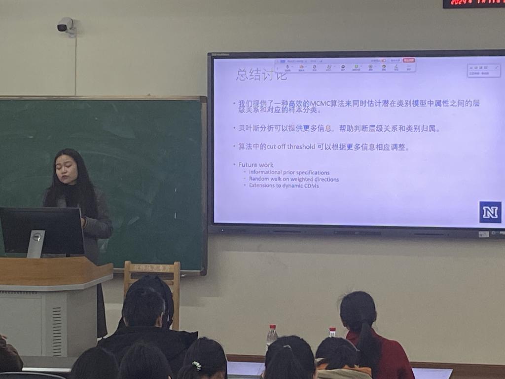 本次讲座以《认知诊断模型中层级关系的贝叶斯分析》为题,贝叶斯分析在地学领域有着广泛的应用,认知诊断模型(CDMs)是一种结构化的潜在类别模型,其中类别属性层次结构对帮助有效分类有着重要作用。在会议中陈教授提到她们开发了Hierarchical CDM的贝叶斯框架并可以直接从数据中估计对应的层次结构,并提供了高效率的Markov Chain Monte Carlo (MCMC)算法来估计对应的类别分类和属性估计。其次陈教授提到而CDM可以看作是潜在类别模型,CDMs就是通过样本对题目的作答来推断其对应的潜在类型。通过贝叶斯分析可以提供更多的信息,帮助判断段层级关系类别归属。