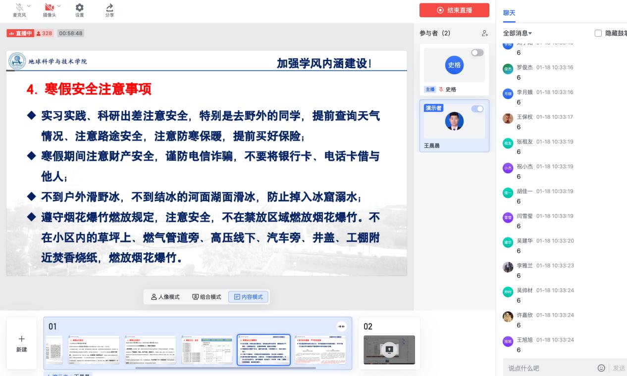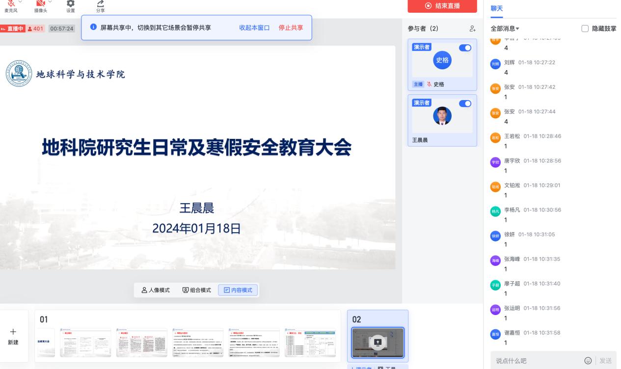 寒假将至,为进一步增强学生安全意识,全面做好假期安全教育管理工作,2024年1月18日上午10点,地球科学与技术学院召开了研究生日常及寒假安全教育大会,研究生辅导员王晨晨老师针对假期安全情况做出相关要求。