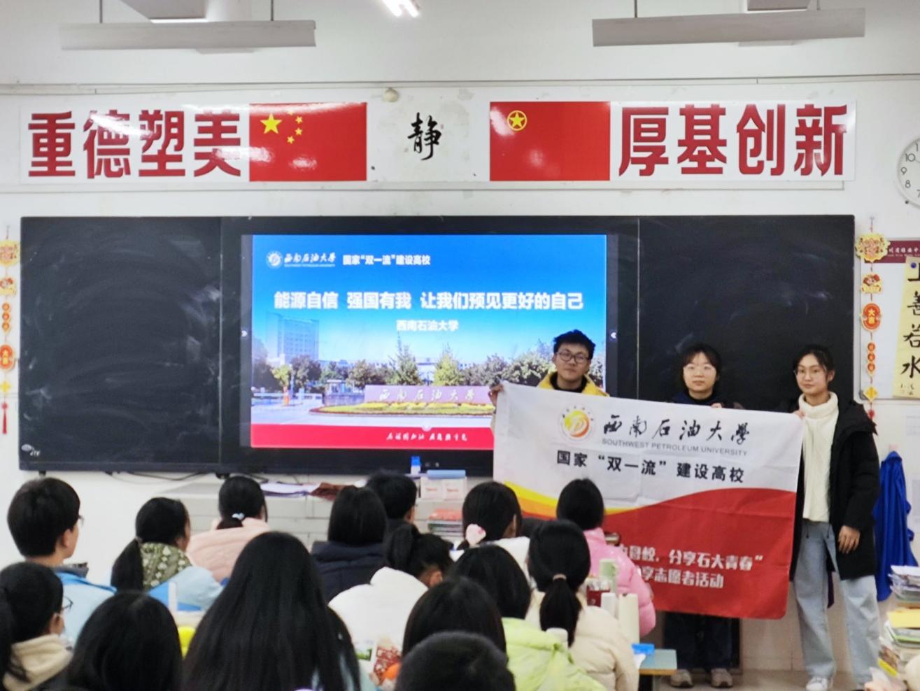 成员张东奇在宣讲会上,结合学校实际情况,通过PPT简要从学校概况、师资力量、学习环境、校园活动、基础设施、招生政策、资助政策等方面,介绍西南石油大学的相关情况。随后,小队成员轮流分享自己的学习经历、大学生活,并结合自身实际,为母校的学弟学妹们提供学习经验