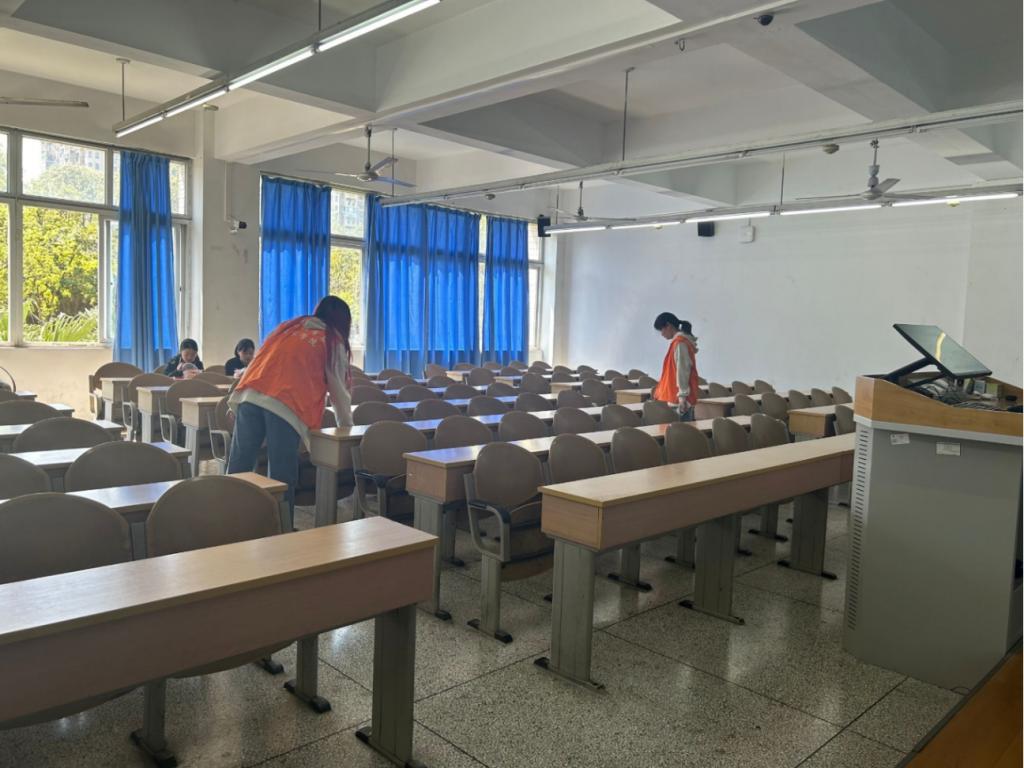 同学们拿到工具后,均匀地分布到各个教室开始清扫。清扫教室是为了让大家在自习和上课都有拥有一个舒爽的环境可以投入进去。在同学们的积极工作下,原本计划三十分钟的楼道清扫只用了二十分钟出头就打扫完了,比原先计划快出了三分之一,也从侧面论证了同学们热情。尽管楼道逐渐炎热,但是拦不住同学们热情的态度以及到场同学对责任的重视。在清扫过程教室中仍存在自习的同,志愿者动作轻快,既没有影响工作效率和质量,也没有打扰到自习的同学。