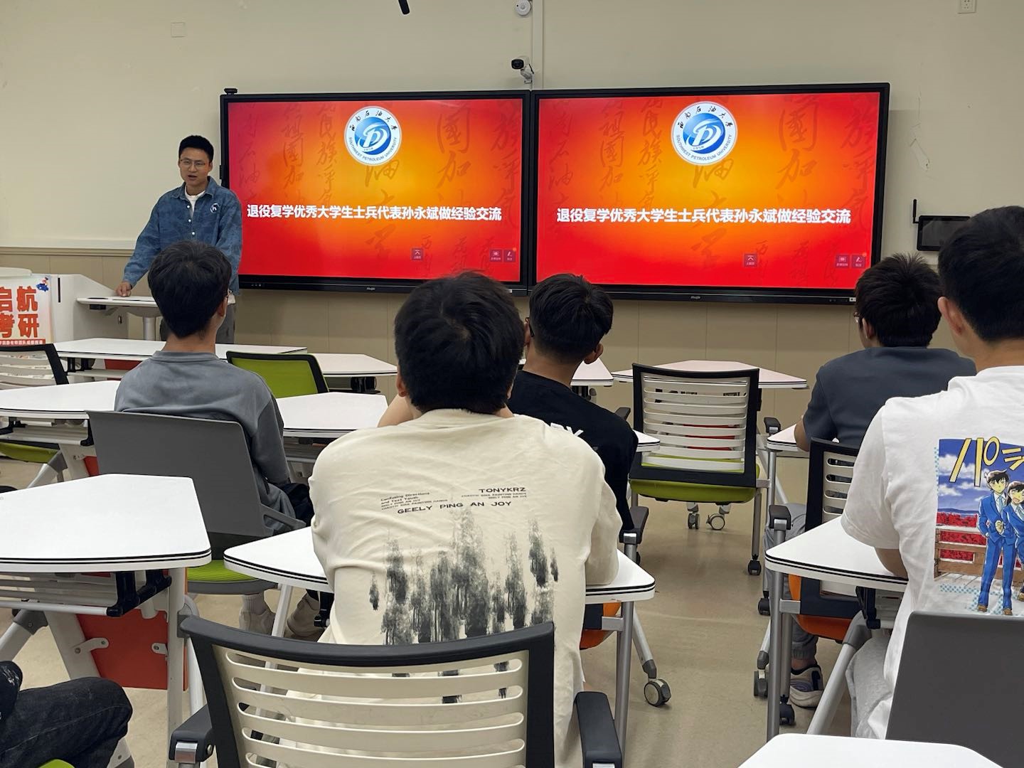 宣讲环节,优秀退役学生代表孙永斌同学分别分享了自己的入伍初心以及在军营中成长、成熟的点滴历程。他表示,军旅生活是人生中最美好的一段回忆,将把这段经历当成人生的宝贵历练、看作报效祖国的人生壮举,始终践行“请党放心,强国有我”的铿锵誓言,谱写新时代的青春之歌。