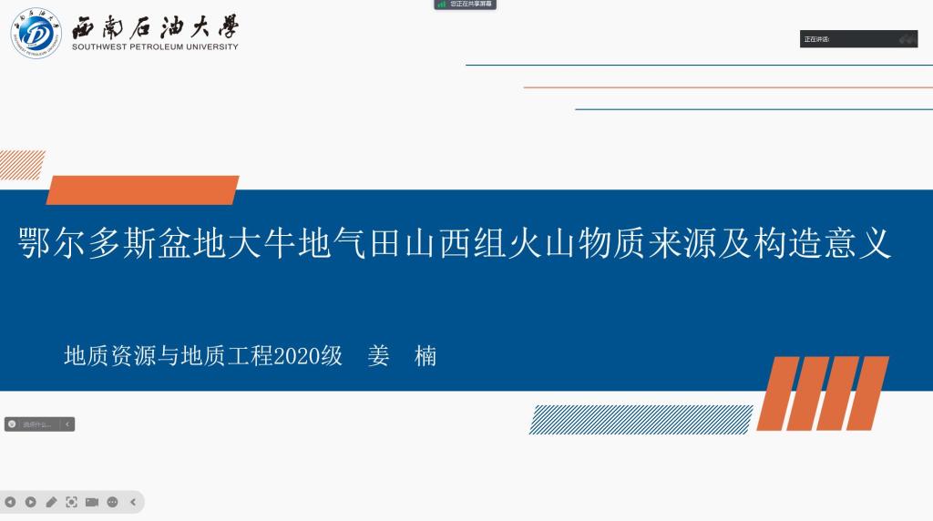 姜楠博士研究生作了题为“鄂尔多斯盆地大牛地气田火山物质来源及构造意义”的学术报告。她表示,已有研究结果表明鄂尔多斯盆地大牛地气田山西组砂岩中普遍含有较多的火山物质,这些火山物质可以为解释兴蒙造山带的构造演化和古亚洲洋的闭合提供重要线索。传统的物源认识无法解释较高含量的、未变质的火山物质来源,且火山物质成分及含量的构造-沉积机理尚不明确。姜楠在报告中提出大牛地山西组的物源区具有“新老”混合的特征,明确了火山物质堆积的构造背景及沉积体系,论证了火山物质的搬运方式,并针对古亚洲洋板块的闭合提出科学观点。