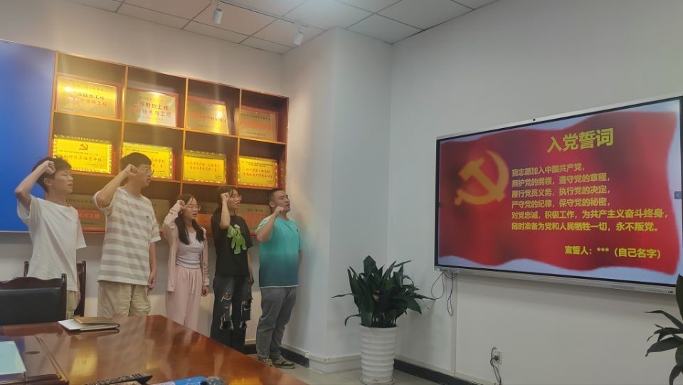 在预备党员转正大会,会议宣布了转正名单和考察结果,何阳、黄丹、龙永洋、袁希亚、薛帅朕五位申请人分别汇报了自身情况,入党介绍人就申请人的情况进行发言,随后党支部讨论并投票表决,具有投票权的正式党员通过了五位申请人的转正申请,五位申请人进行了入党宣誓。