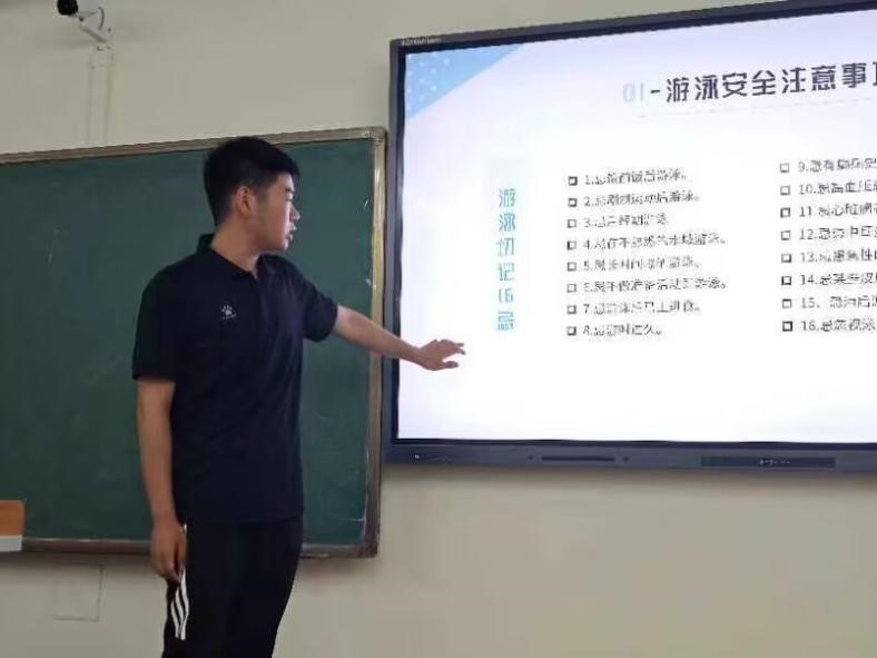 本次班会分为游泳安全注意事项、如何预防溺水、溺水自救与施救三个部分。首先,廖航强调游泳前需要经过体格检查,避免身体出现不适;还要慎重选择游泳场所,严禁前往危险区域游泳。其次,他为同学们讲解如何预防溺水,用“四个牢记”、“六不准”告诫大家要选择合适的时间、地点以及健康的身体状况去游泳,不独自一人外出游泳、不去深水区、下水后不要逞能等等。最后,廖航对溺水自救与施救展开讲解,从溺水致死原因、如何自救、有人溺水如何施救、夏季游泳自救方略等几方面详细分析,向同学们普及了溺水的基本自救和施救方法。他告诉同学们自救是一种本能,在游泳遇到危险时不要慌张,保持头脑清醒,才能做到自救或争取救援时间。