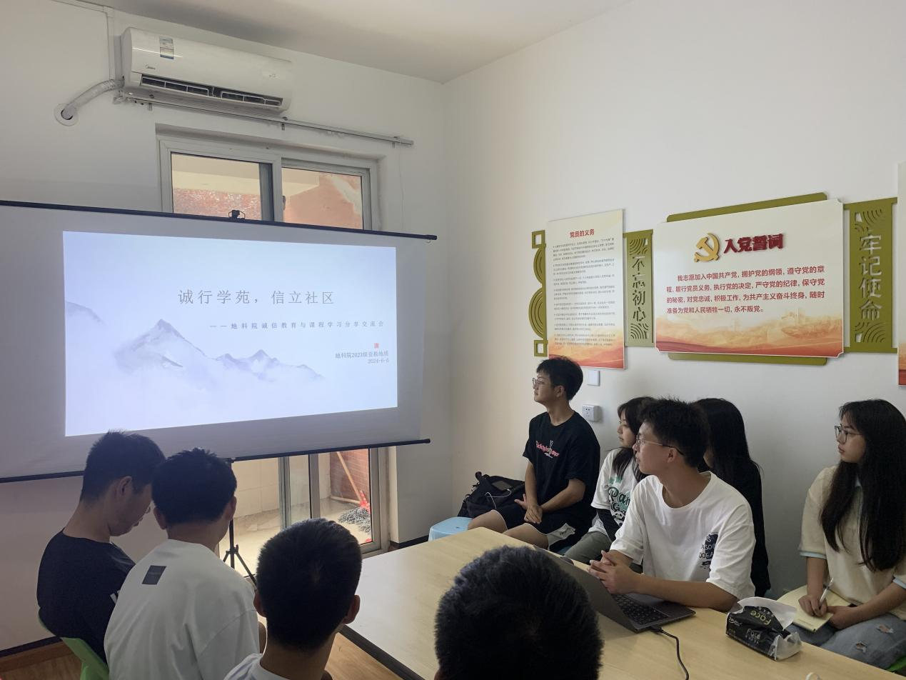 诚行学苑,信立社区。6月6日,地科院诚信教育与课程学习分享会在逐梦研途党建赋能微社区举行。来自学院2023级资源勘查工程、地质学专业的20名同学与辅导员上官晴天畅谈诚信体会,分享学习经验,共话规划成长。