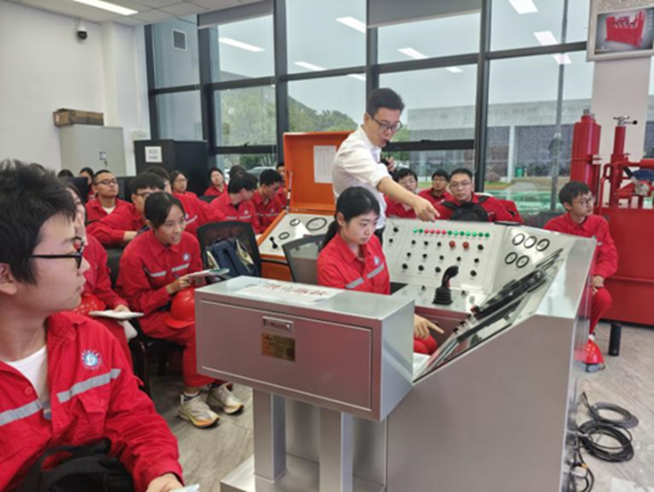 实习队员首先在中石化西南石油工程员工培训中心进行了基于全尺寸钻井模拟培训系统的学习体验。由于在整个钻井全过程中均会涉及到地质工作且目前质工程一体化已成为解决复杂油气藏勘探开发的必由之路,石油高校资勘专业同学了解钻井工程成为一项十分必要的任务。“实际钻井过程中存在许多危险因素,针对石油高校学生实习与公司员工培训需求,我司开发了全尺寸钻井模拟培训系统。系统基于先进的计算机工控技术、人工智能技术、虚拟现实技术、三维可视化技术可产生与现场情况相似的视觉效果,可提供如起下钻、钻进、井控、钻井事故处理等多种模拟操作。”培训中心王百峰副主任向实习队详细介绍了虚拟钻井平台,以及立管管汇、司钻控制台、节流管汇、压井管汇等设备,并在远程控制台带领实习队同学们模拟演示钻井时会遇到的一些现象。实习队员在王百峰的指导下亲手进行了包括起下钻、软关井流程在内的各种操作,李雯同学在完成实操后兴奋地说:“操作虚拟钻井平台让我有身临其境的沉浸感和逼真感,切实感受到了石油工业的高科技含量,生产实习能有这样特殊的体验让我感觉很有用也很有趣。”虚拟钻井平台实习结束后,实习队前往培训中心的安全实操培训基地参观钻井现场标准化建设,近距离地参观学习井场设施、钻具、钻机以及井场录井仪器及设备。