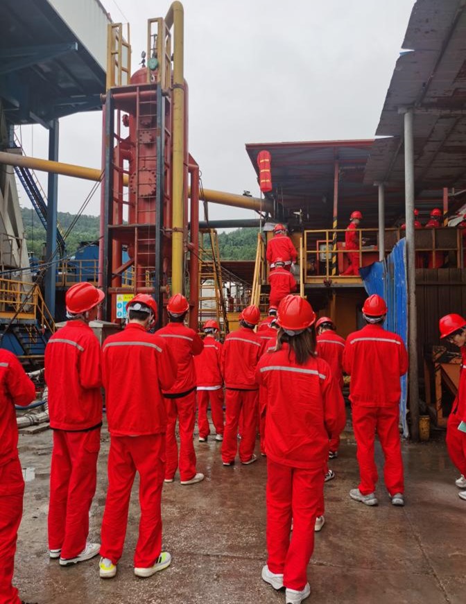 在开展了全尺寸钻井模拟和基地钻井井场学习体验后,实习队继续前往位于广元剑阁县柘探1井钻井现场开展钻井及钻井地质实习。该井为中石油西南油气田公司的一口目的层为寒武系沧浪铺组的风险探井,井深超过7900米,目前正在钻进中。进入井场后,地质技术员带领大家参观了解整个井场,并详细介绍了井场基本布局、地面管汇、钻机类型及装备情况、钻机的主要构成、泥浆循环系统、地质录井流程等。实习队黄帅同学表示:“亲眼看到振动筛在不停地振动过滤岩屑,深褐色的油基泥浆在泥浆池里涌动的钻井动态画面,内心十分震撼。在井场学习钻井工程和地质录井知识,还能和现场技术员交流探讨工程和地质问题,能接触到许多现场第一手地质资料,更体会到了生产现场石油人务实的工作作风和严谨的工作态度。”
