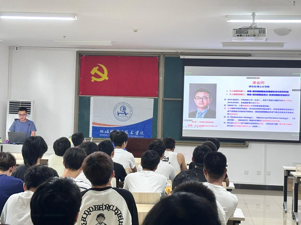 “梁金同研究员长期从事碳酸盐岩沉积成岩与模拟领域科研与教学工作,先后主持国家自然科学基金青年项目1项、国家能源碳酸盐岩油气重点实验室开放基金项目1项,主持或参与横向科研委托科研项目10余项,在国内外期刊发表科研论文10余篇。”霍飞老师在讲座开始前为大家介绍了梁金同老师的成就和研究方向,激发了同学们的兴趣。