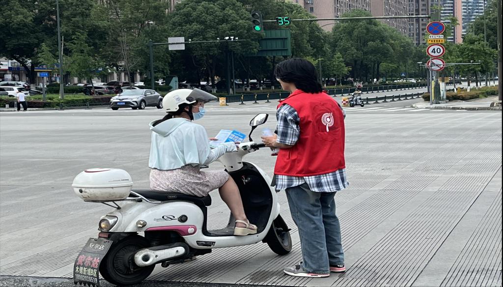 随后实践队分作几个小组,深入社区周围向居民分发宣传册,并耐心讲解交通安全规则,他们用通俗易懂的语言向居民普及遵守交通信号,行走斑马线,佩戴安全头盔等重要交通安全知识,提醒居民要时刻牢记交通安全,保护自己和他人的生命安全。