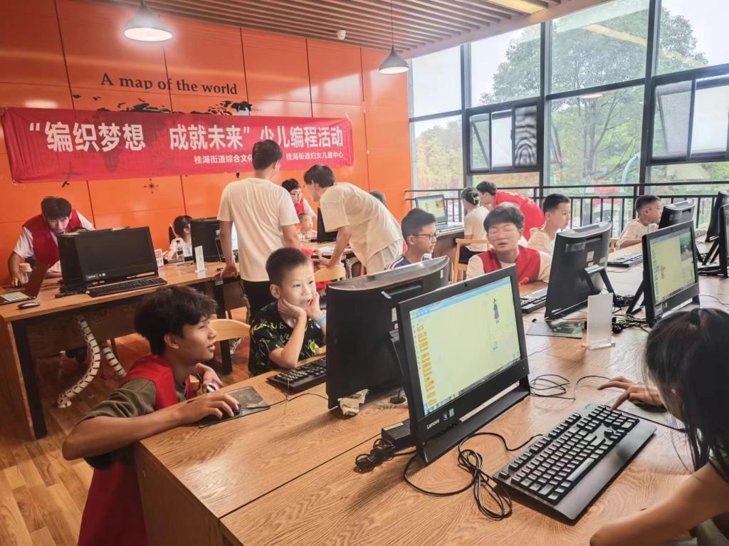 习近平总书记多次在不同场合表示:“少年儿童是祖国的未来,是中华民族的希望”,西南石油大学地球科学与技术学院2023级七彩探索暑期社会实践队积极响应号召,一场别开生面的少儿编程活动于7月23日在新都区桂湖街道综合文化中心开展,为孩子们打开了一扇通往科技世界的神奇大门。