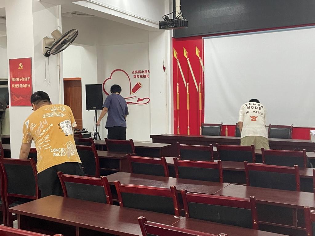 与此同时,为了给社区工作者们提供一个干净的工作环境,志愿者们手持扫帚、垃圾袋等工具对办公室与会议室进行了全面清理,将办公桌上、书架上、会议桌上的文件、书籍、杂物等进行分类整理,将不需要的物品清理出去。打扫完成后,再对整个党支部进行全面检查,确保没有遗漏的地方,物品摆放整齐,环境整洁干净。