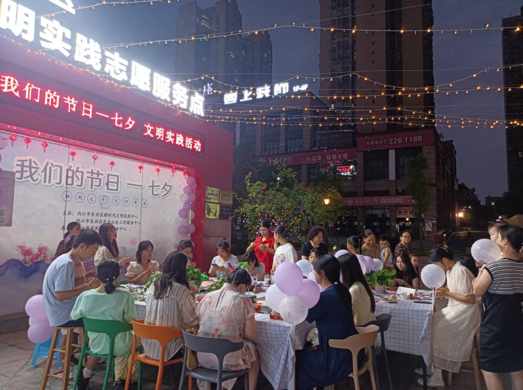 2024年8月10日晚,“立青春之壮志,扬繁星之璀璨”筑愿服务队来到了内江市东兴区新时代文明实践点,辅助春风服务中心完成七夕节主题活动。