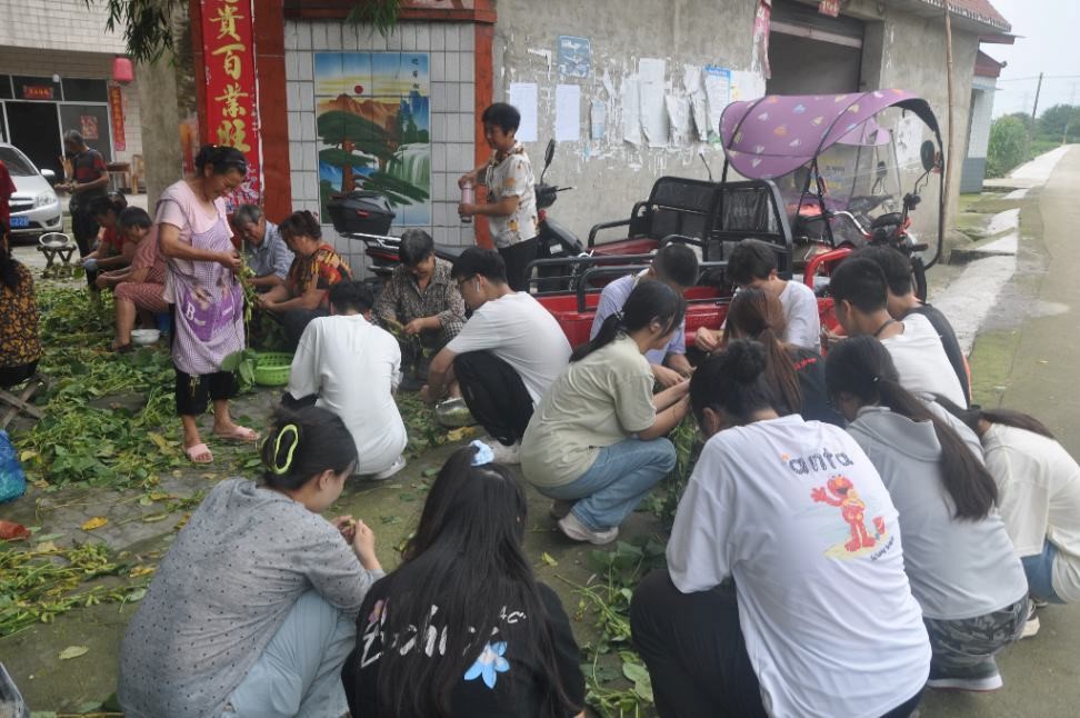 初入同心村就被映入眼帘的大片的水稻田所吸引,实践队员们走在这条美丽的乡村小路上开启他们一天的志愿活动。在夏日的阳光下,实践队员们聚集在村民家的院子里,忙碌而又充满活力。他们一边交流着生活琐事,一边专心致志地剥着晾晒在院子里的丰收毛豆。阳光下,他们的笑容显得格外明亮和温暖,与村民们的笑声交织成一幅幸福的画面。这不仅是一场简单的劳动,更是每位实践队员们与村民们之间情感交流的美好时刻。