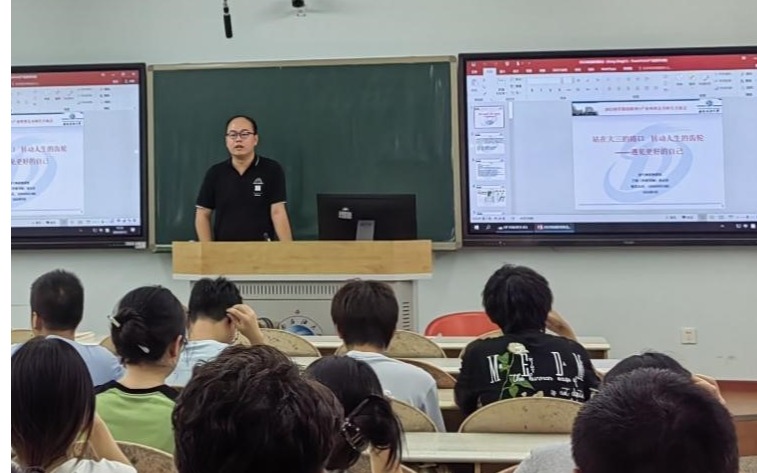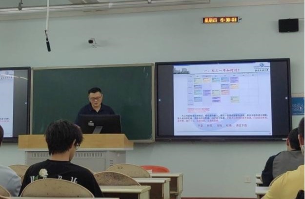 丁熊老师向学生们进行了自我介绍,以《站在大三的路口 转动人生的齿轮——遇见更好的自己》为题,通过“大三一年如何过”、“课程学习建议”和“如何走进科研的建议”三个部分,结合个人学习成长经历,贴近学生生活,分析了专业前景,切身实地的和学生们进行了深入交流。