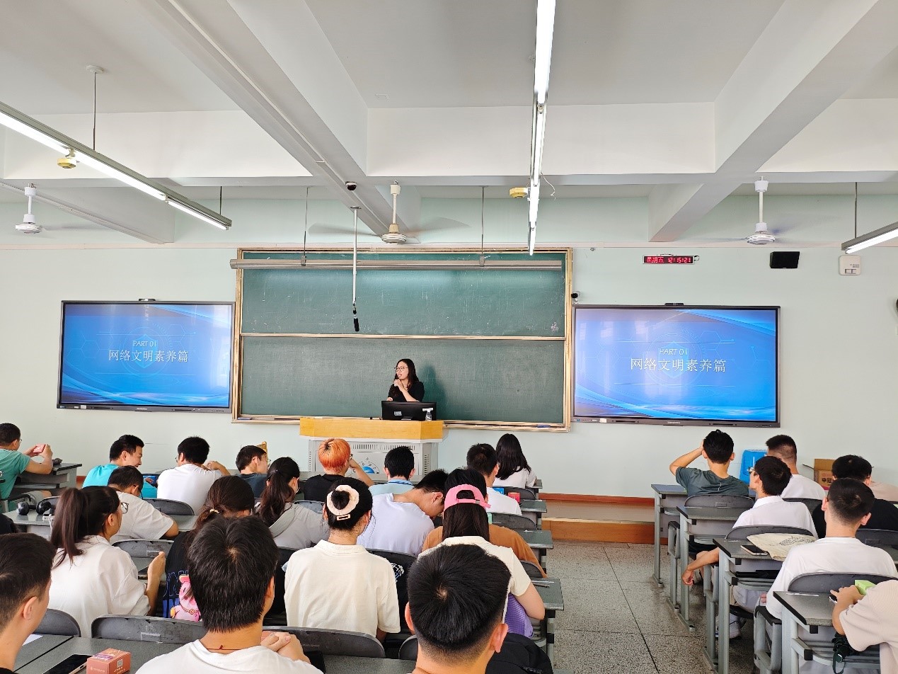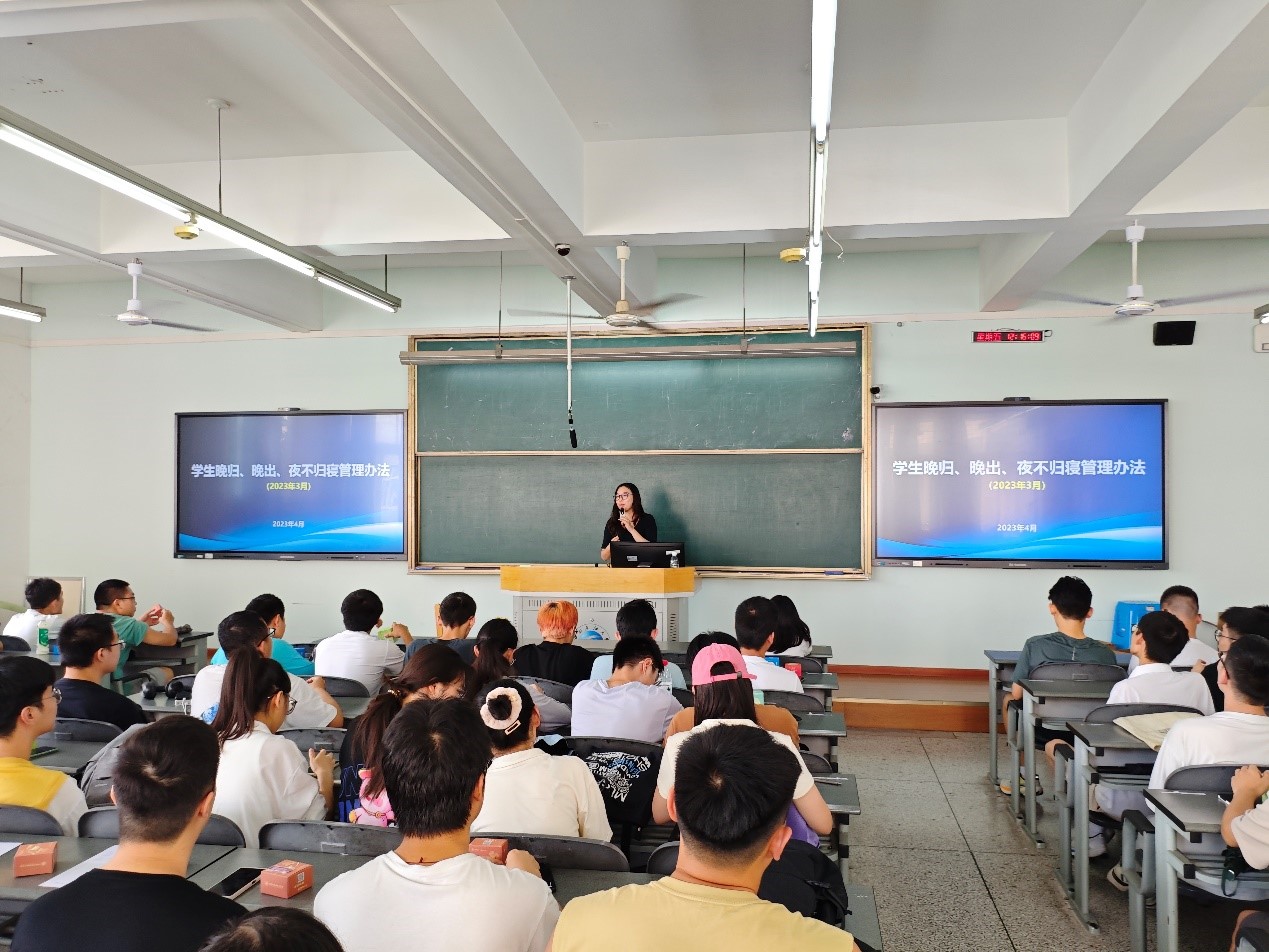 “寝室作为同学们日常生活的重要空间,直接关系到每位同学的生命财产安全。”刘杨洁雅提醒与会同学们要提高防火意识,严格遵守学校规定,不私拉电线、不使用违规电器、不随意堆放易燃物品,确保寝室环境的安全整洁。随后,她对学校晚出晚归、校外住宿等规章制度进行详细条例解读,要求同学们严格遵守学校相关制度,做到安全、守纪。在网络安全板块,刘杨洁雅提到:网络虽然是虚拟空间,但绝对不是法外之地,一定要提高政治站位,甘于在网络上对错误思潮亮剑。