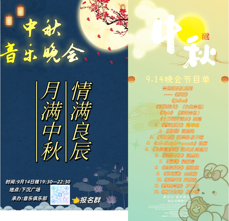 2024年9月14日的晚上19:30,我校音乐俱乐部于地科院明辨楼c205阶梯教室成功举办中秋音乐晚会,约150名同学们一起度过了美好的中秋之夜。