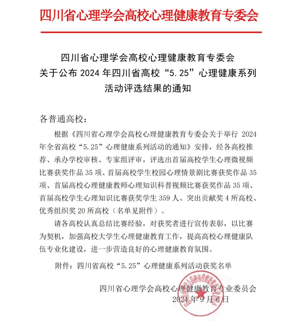 近日,四川省心理学会高校心理健康教育专委会2024年四川省高校“5.25”心理健康系列活动评选结果公布。我院原创心理情景剧《夜空中最亮的星》荣获二等奖。