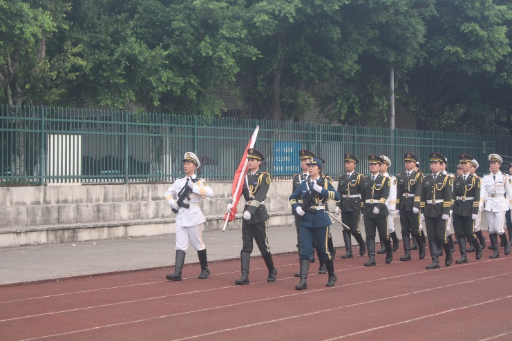 仪式伊始,国旗护卫队精神饱满、昂首阔步,迈着整齐统一、铿锵有力的步伐护送五星红旗走向升旗台,尽显飒爽英姿。随着激昂的《义勇军进行曲》奏响,鲜艳的五星红旗在旗手的护卫下,缓缓升起。全体师生肃立,行注目礼,高唱国歌,表达对祖国的深深热爱和敬意。