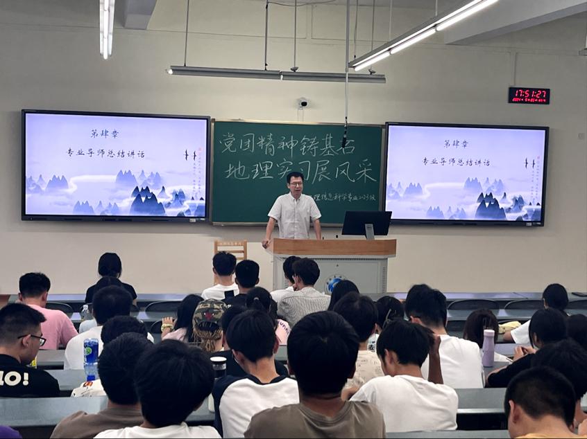 王老师首先强调了团课学习对于塑造同学们正确价值观和坚定信仰的重要性,随后对同学们在实习中的不怕吃苦、认真学习的积极态度给予了高度赞扬。他特别指出,同学们所创作的微视频作品,不仅内容新颖、制作精良,更是将团课学习的精髓与地理实习的实践紧密结合,展现了同学们对专业知识的深刻理解和对党团精神的忠诚传承。这些作品不仅是同学们个人才华的展现,更是地理信息科学专业团队精神的体现。