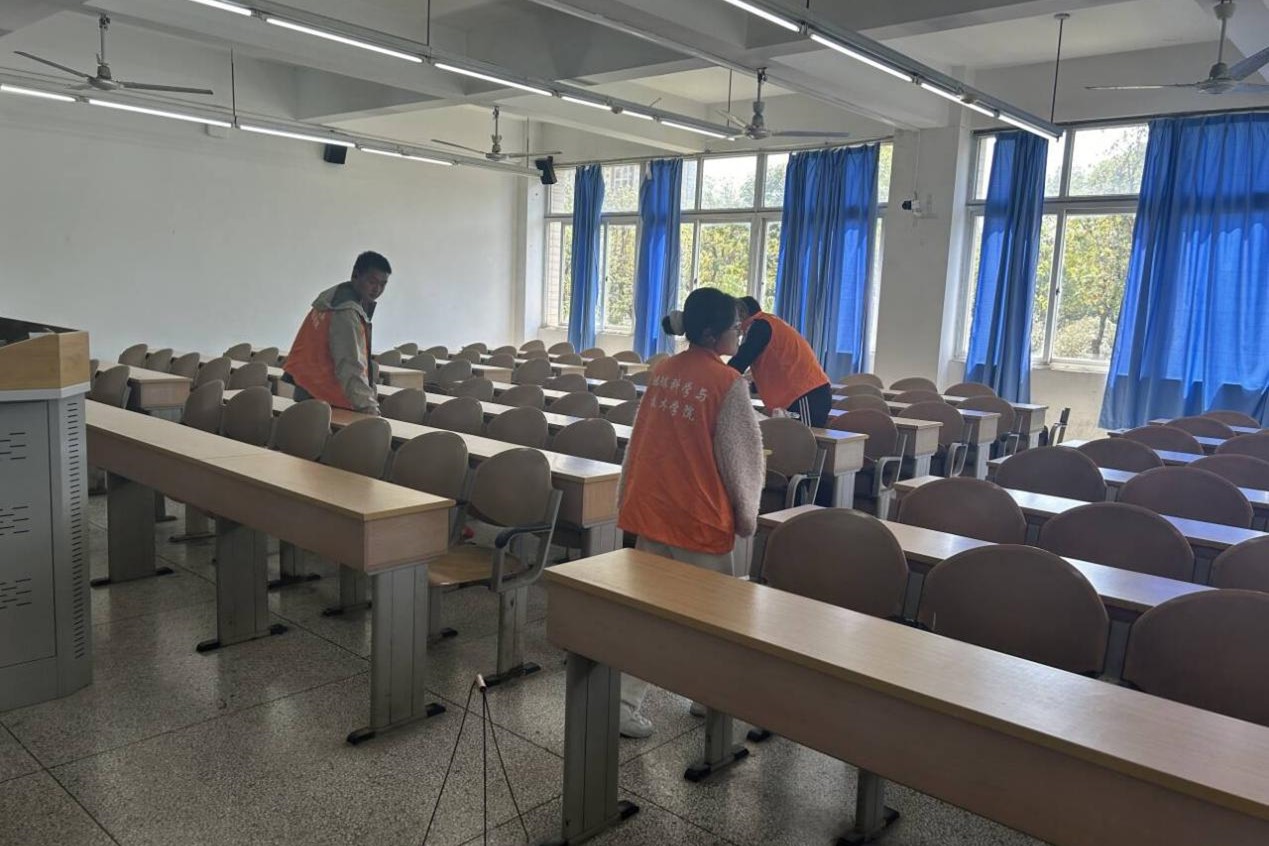 活动当天,在阳光穿透薄雾,洒在校园的每一个角落时,志愿者们已经整装待发。他们身着统一的橙色马甲,在地科院青协负责人的带领下,领取各自的清扫工具,并按照事先规划好的区域,分为三个小组,分别进行一楼至三楼的教室与走廊的清扫活动。志愿者们分工明确,各司其职,一丝不苟地擦拭门窗、桌椅,清理卫生死角,除此之外,他们还将桌椅板凳摆放整齐,用抹布认真擦拭黑板。经过半个小时的努力后,明辨楼焕然一新,桌椅整齐,地面锃光瓦亮相较于之前的脏乱环境而言更加使人眼前一亮。