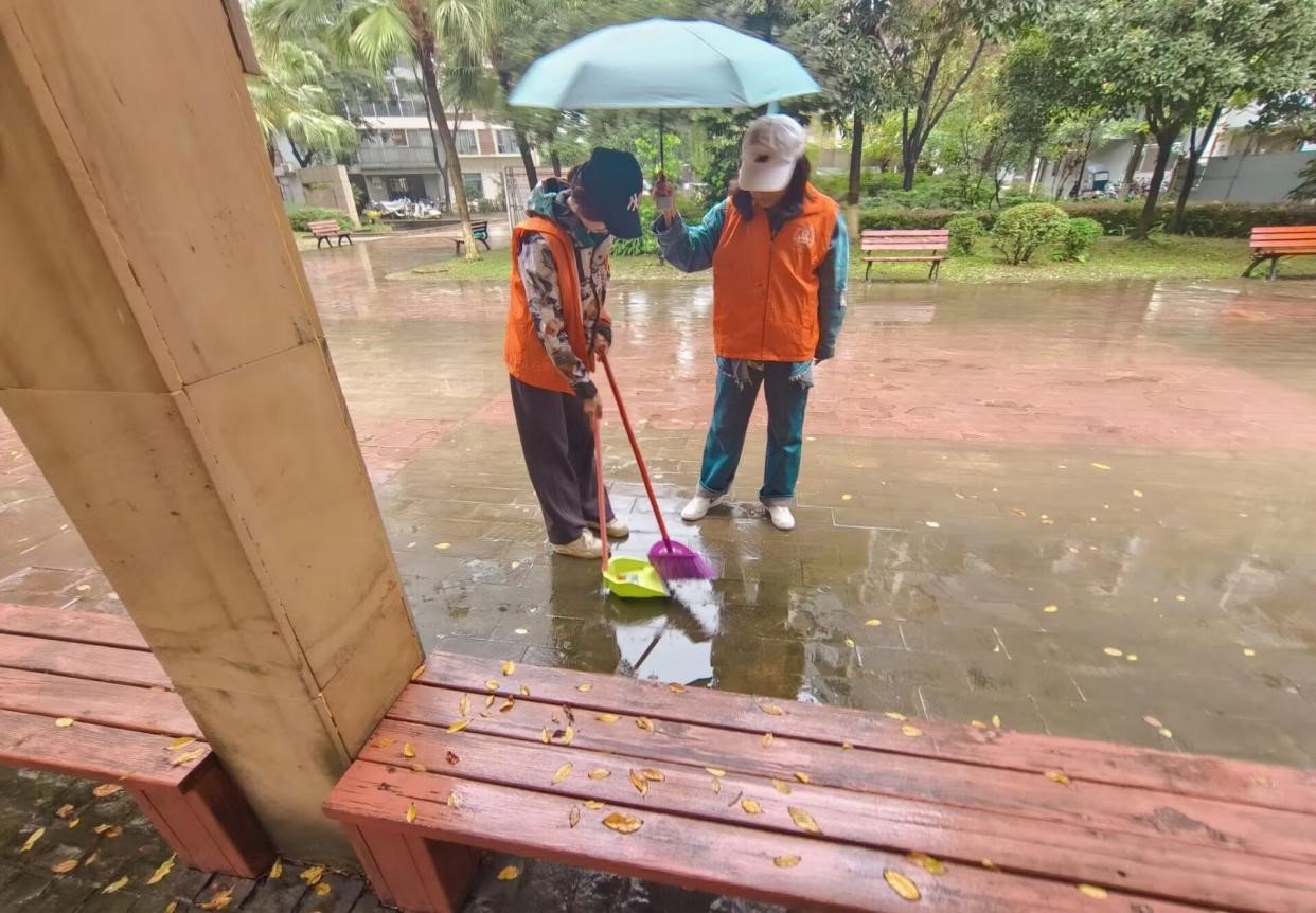 淅淅沥沥的下雨见证了我们的努力,在活动当中,志愿者们被分为了若干个小组,分别负责不同区域的清扫。身着橙色志愿服装的我们,左手提着扫帚,右手擎着簸箕,不妨说这是一场没有硝烟的战争,但好在我们都是身经百战的卫士。经过半个小时的“鏖战”,石油社区内外早已焕然一新。
