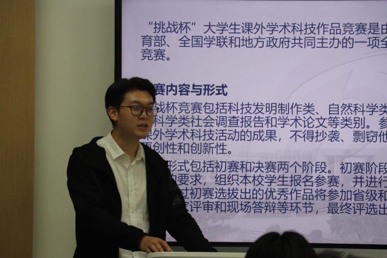 程鑫老师强调了“挑战杯”大学生课外学术科技作品竞赛作为“A+”类学科竞赛的重要意义,指出这是学生展示自我、提升能力的重要平台,希望学生们通过参与竞赛,能够将理论知识与实践相结合,培养团队协作精神和创新能力,为未来的发展奠定坚实基础。并围绕“挑战杯”赛事相关要求进行了全面解读,着重强调了选题的重要性,提出了选题立意要新颖、立足解决当下难点痛点问题、与学院专业学科特色相结合等一些实质性建议。