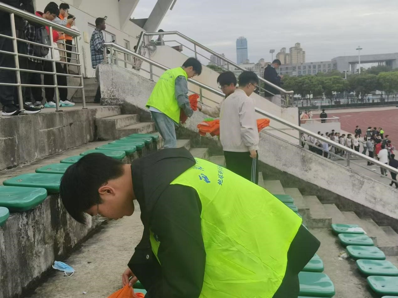 比赛当天,青志协委员们提前来到看台集合,组织观众领取统一的服装和分发拍拍掌,随后提醒大家文明观赛的注意事项。在青志协委员们的简要说明后,大家投入紧张而刺激的比赛的同时,也时刻注意着自己周围的卫生状况。比赛结束后,青志协委员们立即疏散大家有序离开,在提前分配好的区域展开垃圾捡拾活动,捡拾纸屑,收集饮料瓶,整理本院的旗帜和用于加油的大鼓,在短时间内结束了赛后整理工作。整个工作期间委员们协作互助,高效完成了志愿工作。