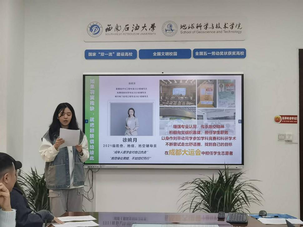在答辩过程中,各答辩人准备充分,发挥稳定。首先,各优秀学生干部和三好学生从思想道德、专业学习、学科竞赛、社会工作等方面展现自我风采。接着,各先进班级学生代表通过PPT展示班级在党团建设、制度建设、学风建设、综合发展等方面所取得的成就。勘查技术与工程专业2022级张竹青以“地质精神助翱翔,罗盘引航勇担当”为题,讲述自己在大学生全媒体中心、学校青年志愿者协会以及班级团支书工作的经历和感悟;城市地下空间工程2021级罗玄黎以“自能生羽翼,何必仰云梯”为题,以雏鸟自喻,讲述自己从一路从“羽翼残缺”到“展翅翱翔”的奋斗历程;地理信息科学2023级2班以“知行合一,绘梦地信”为题,讲述具有专业特色的“四位一体”、“1+2+3”和“三个优质”的班级建设与管理方模式。每一位同学的答辩都各有千秋,独具特色。