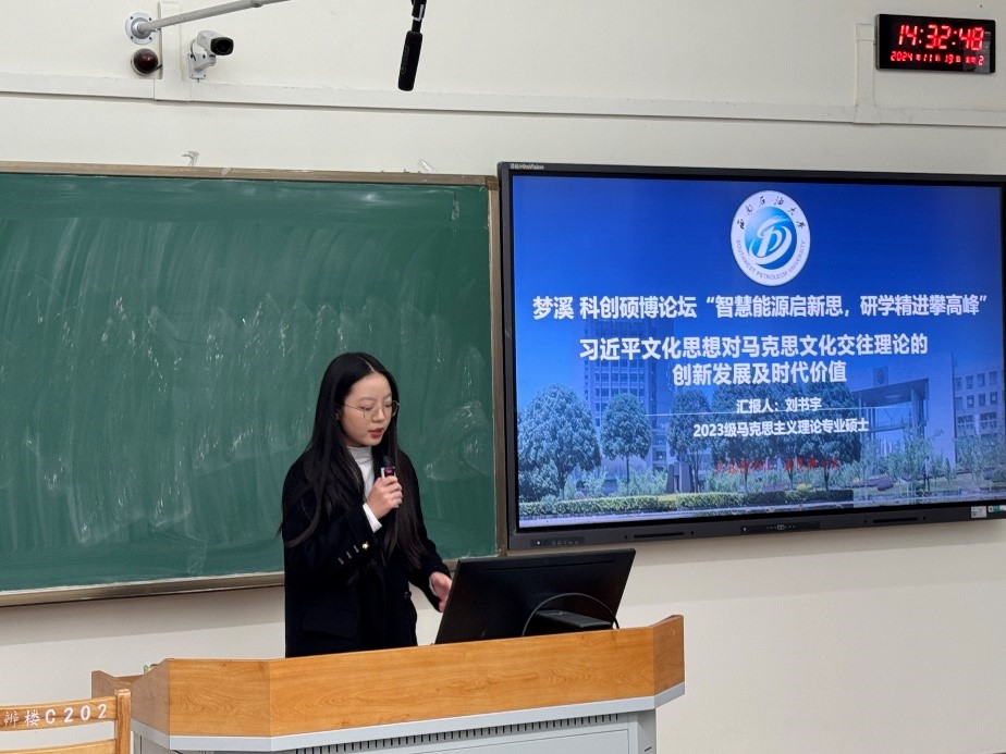 马克思主义理论专业2023级硕士研究生刘书宇首先作了题为《习近平文化思想对马克思文化交往理论的创新发展及时代价值》的报告。她从马克思文化交往理论的基本框架切入,结合习近平文化思想的发展脉络,深入剖析了理论创新的具体表现及其对当代社会文化发展的引领作用。通过细致的案例剖析,她阐释了文化交往理论在全球化中的重要实践意义,并提出文化领域理论与实践结合的新方向。