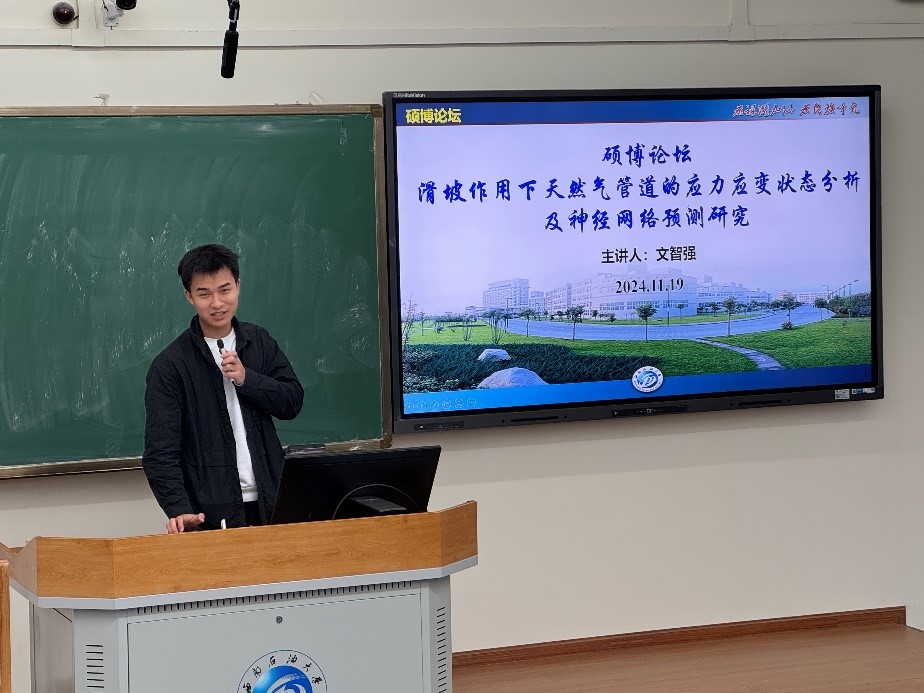 2024年11月19日14:30~16:30,为深入贯彻习近平新时代中国特色社会主义思想和党的二十大精神,落实习近平总书记关于弘扬教育家精神和科学家精神的重要指示,全面提升研究生的科研素养与创新能力,西南石油大学“研究生学术科技文化月”系列主题活动之梦溪·科创硕博论坛第二期学术报告在明辨楼C205成功举办。本次论坛主题为“智慧能源启新思,研学精进攀高峰”,旨在搭建跨学科学术交流平台,促进研究生之间的学术对话与思维碰撞。论坛吸引了多个学院的学生共同参与,四位研究生分别从马克思主义理论、法学及石油工程等学科领域展开了精彩的学术分享。