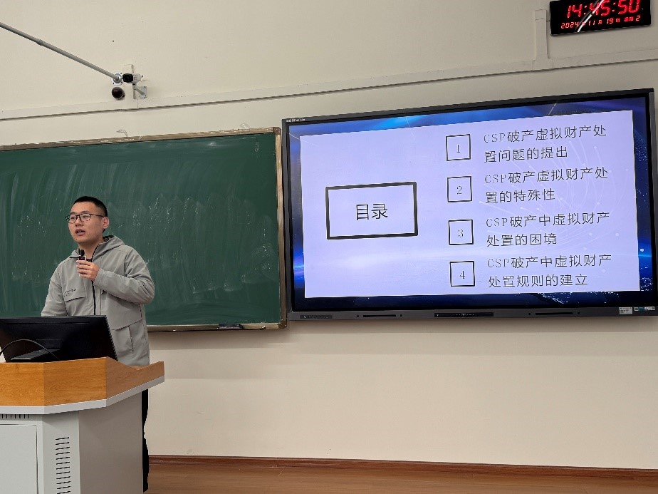 法学院陈汉同学的报告《当技术比法律更快时:CSP破产虚拟财产处置规则》聚焦于技术快速发展带来的法律挑战。他以CSP破产虚拟财产处置为核心,系统分析了这一问题的特殊性与现存法律框架的困境,并通过剖析典型案例与数据建模,他提出应该建立具有前瞻性的CSP破产虚拟财产处置规则,为虚拟财产权益保护提供了理论依据和实践参考。