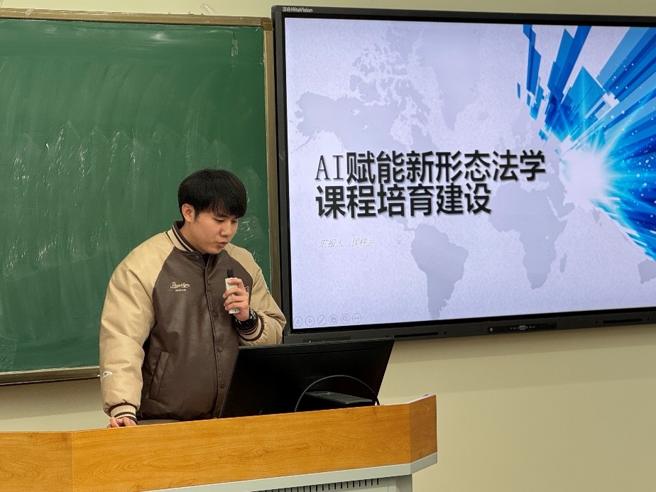随后,法学院硕士研究生侯栋尹以《AI赋能新形态法学课程培育建设》为主题,探讨了人工智能技术在法学教育领域的深度应用。他详细分析了AI技术引入法学课程的动因及实现路径,并提出了一套优化法学教育的具体策略,包括课程设计、智能工具辅助教学及跨学科知识融合,并展望了未来法学教育在技术赋能下的创新方向。