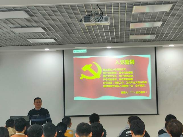 大会准时开始,党支部全体成员起立,奏唱国歌,大会在严肃认真的氛围中进行。本次大会的主要议题是关于接收李思瑶等18位同志党员转正的问题。首先各位转正的同志都依次进行了个人简介、对党的认识、学习与工作以及不足与改进等方面的阐述。李思瑶等12位同志的入党介绍人依次介绍了申请人的情况、优点与不足、今后的努力方向,并表明是否同意其如期转正。之后李思瑶等18名申请转正的同志回避,与会正式党员发表意见,对李思瑶等18名同志能否转正进行了充分讨论,由党支部35名正式党员进行民主表决,经表决,与会35名正式党员一致同意、全票通过接收李思瑶等18名同志转为正式党员。随后,李思瑶等18名转正党员面对党旗进行了庄严的入党宣誓。