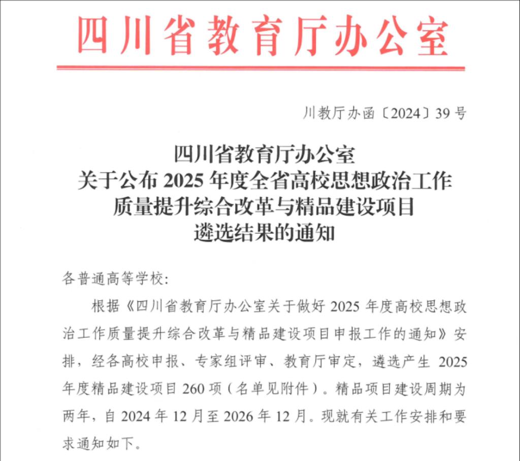 近日,四川省教育厅公布了2025年度全省高校思想政治工作质量提升综合改革与精品建设项目(以下简称“思政项目”)遴选结果,学院申报的3个项目,全部入选,立项数全校第一。学院党委书记赵晓明牵头高校原创文化精品《密码》,院长黄旭日牵头高校综合性教育实践体验基础——“地质报国”科普大思政教育实践体验基地,学院党委副书记张勇高校思想政治工作中青年骨干成功获批。