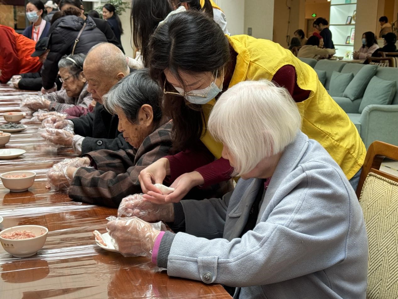 图2志愿者耐心帮助老人包饺子和汤圆