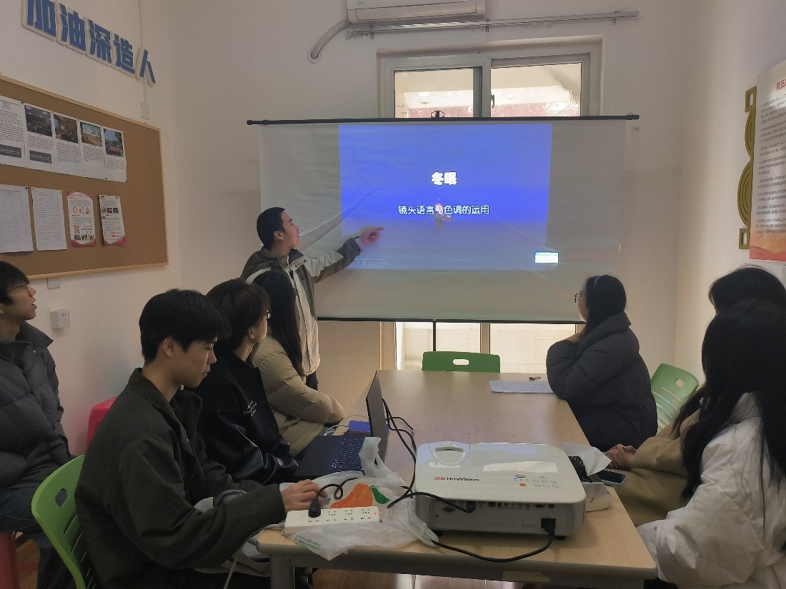 工作室三名成员先后围绕短剧创作、电影拍摄手法、演技提升等内容进行交流分享。陈怡君通过分析《热烈的17岁》等作品,探讨剧名运用反讽手法的特点和效果;再以《元气200%治愈的热海之旅》等为例,强调主题明确和感染力在作品中的重要性。杨挥翔以镜头色调语言的应用为题,以一部微电影为例,分析其中的框架式构图、伏笔设置、冷暖色调的运用等镜头语言。杨超以“怎样的表演才是好表演”为讨论口,与参会师生分享交流自己的参演经验。
