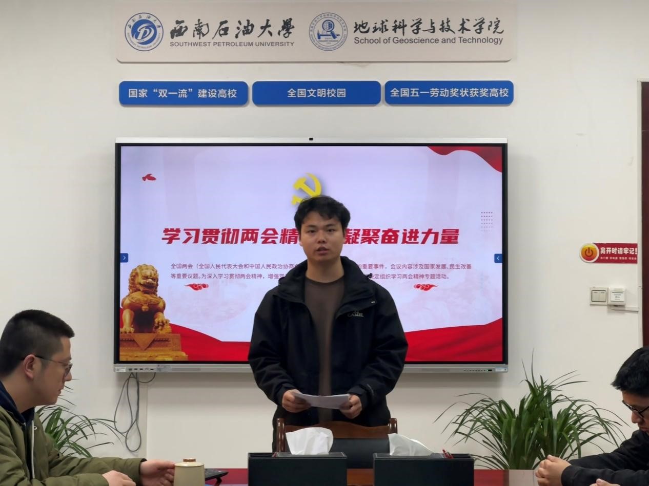 全国两会(全国人民代表大会和中国人民政治协商会议)是我国政治生活中的重要事件,会议内容涉及国家发展、民生改善等重要议题。为深入学习贯彻两会精神,增强党员的政治意识和大局观念,3月20日下午,地科院本科生勘查技术与工程寻油尖兵党支部在明辨楼A302会议室组织学习两会精神专题活动。此次活动由支部书记黄爽老师主持,支部全体党员参加。