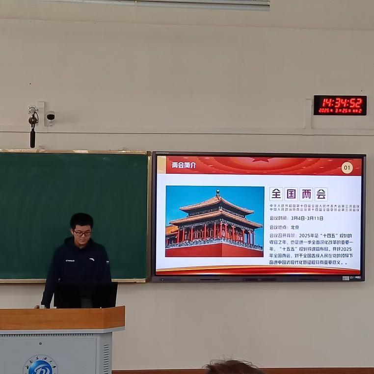 王源浩同学,领学了自己对两会精神的理解和感悟。他结合自己的学习经历和生活实际,深入浅出地阐述了两会精神的五个要点,并指出了两会与我们的四大联系。着重强调了两会将全面提高人才队伍质量和激发数字经济创新活力,以此鼓励同学们大胆创新、不断探索,同时提出我们要合理利用Al,使其成为学习上的强力工具,为推动勘查行业智能化发展贡献力量。