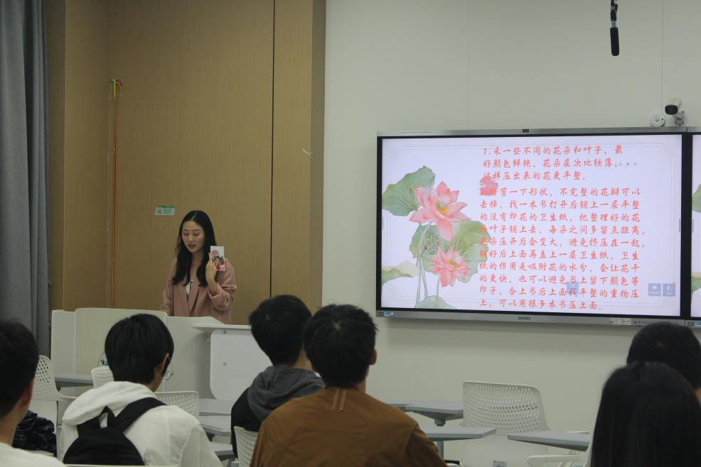 为了让同学们在繁忙的学业中能够切身感受春日花草的美好,把春天装进书签里,夹在书页中,更是融入每个人的心中。4月29日11:40于明辨楼C106开展一站式社区活动——春笺物语·花草手作局,活动由地科院辅导员周雅倩主持。