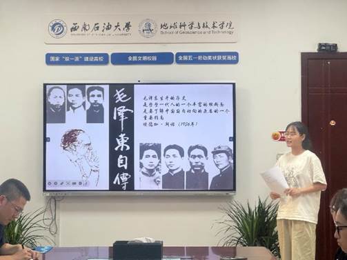 本次活动的牵头支部为本科生勘查技术与工程寻油尖兵党支部,由支部书记黄爽老师主持,三位分享人张丽丽、华礼潇、朱文静,分别对《毛泽东自传》《红星照耀中国》和《青春之旅》三部经典著作进行了深入解读与分享。分享人以严谨的学术态度和深刻的思考,从不同角度剖析了书籍的思想内涵与时代价值。