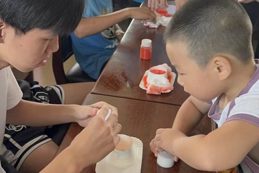 理论讲解后,成员们带领孩子们动手模拟火山喷发实验。志愿者们将用纸杯和纸盘塑造成的火山模型分发给孩子们,指导孩子们逐次倒入小苏打和柠檬酸,随后加入水。顷刻间,“岩浆”翻滚喷涌,引得孩子们惊呼连连,原来火山喷发就像‘汽水冒泡泡!通过直观体验,孩子们对火山喷发的现象印象更加深刻了。