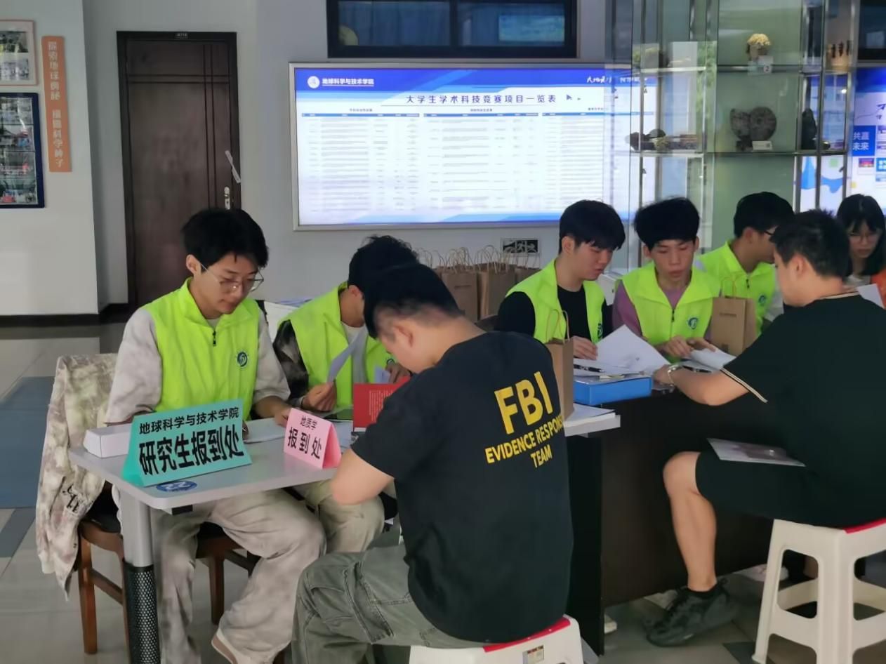 2025年9月5日至6日,在明辨楼A区大厅,西南石油大学地球科学与技术学院迎来了2025级研究生新生入学报到。秋雨洗征尘,桂香候新人。来自全国各地、怀揣地质理想的新生们陆续抵达校园,即将在地科院开启新的学术征程。为保障报到工作高效有序开展,地科院提前制定了详细方案,在现场设置了地科特色展览区、材料审核区、指引区等功能区域。由辅导员和学生组成的志愿服务团队为新生提供“一站式”服务,全力协助新生完成各项入学手续。